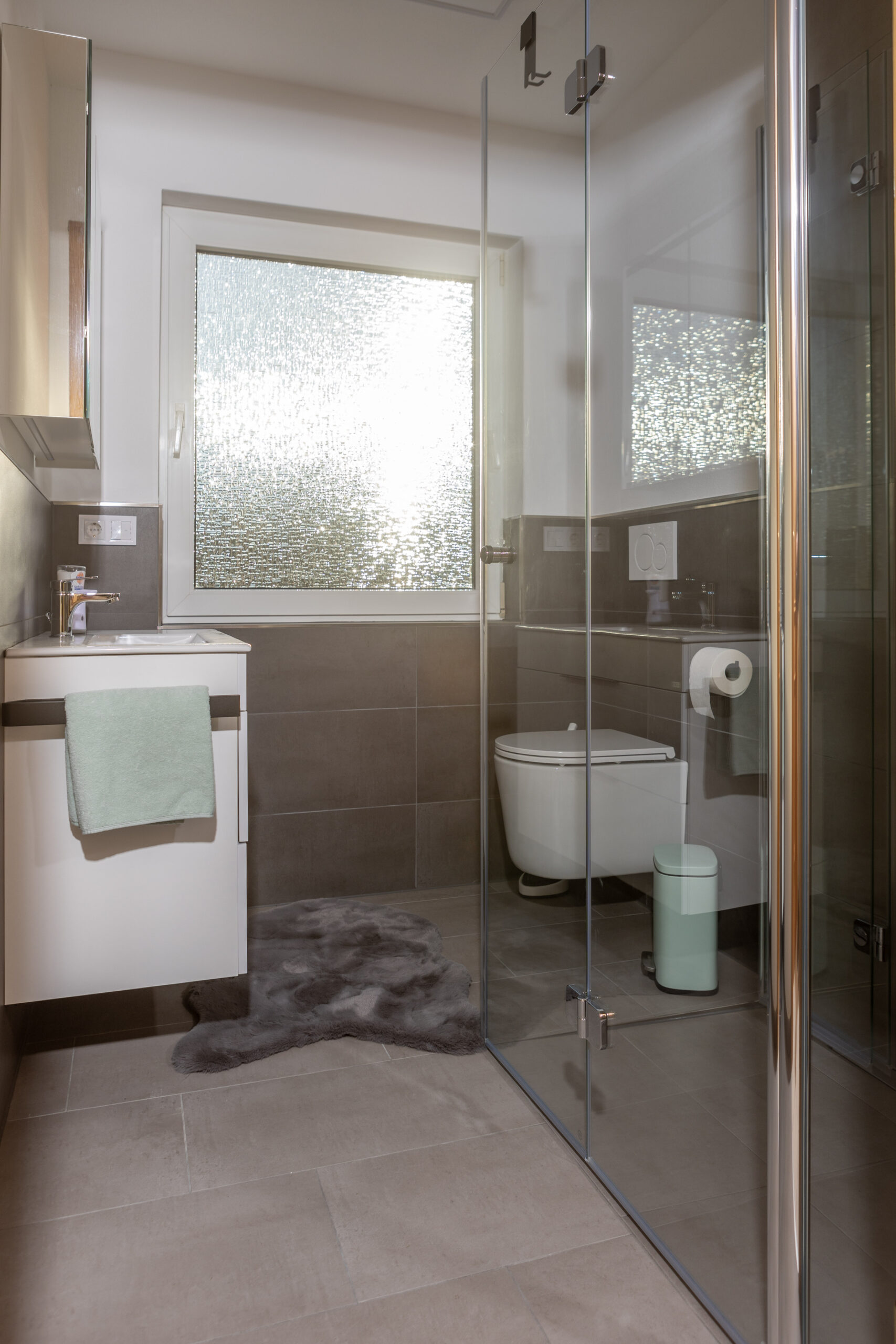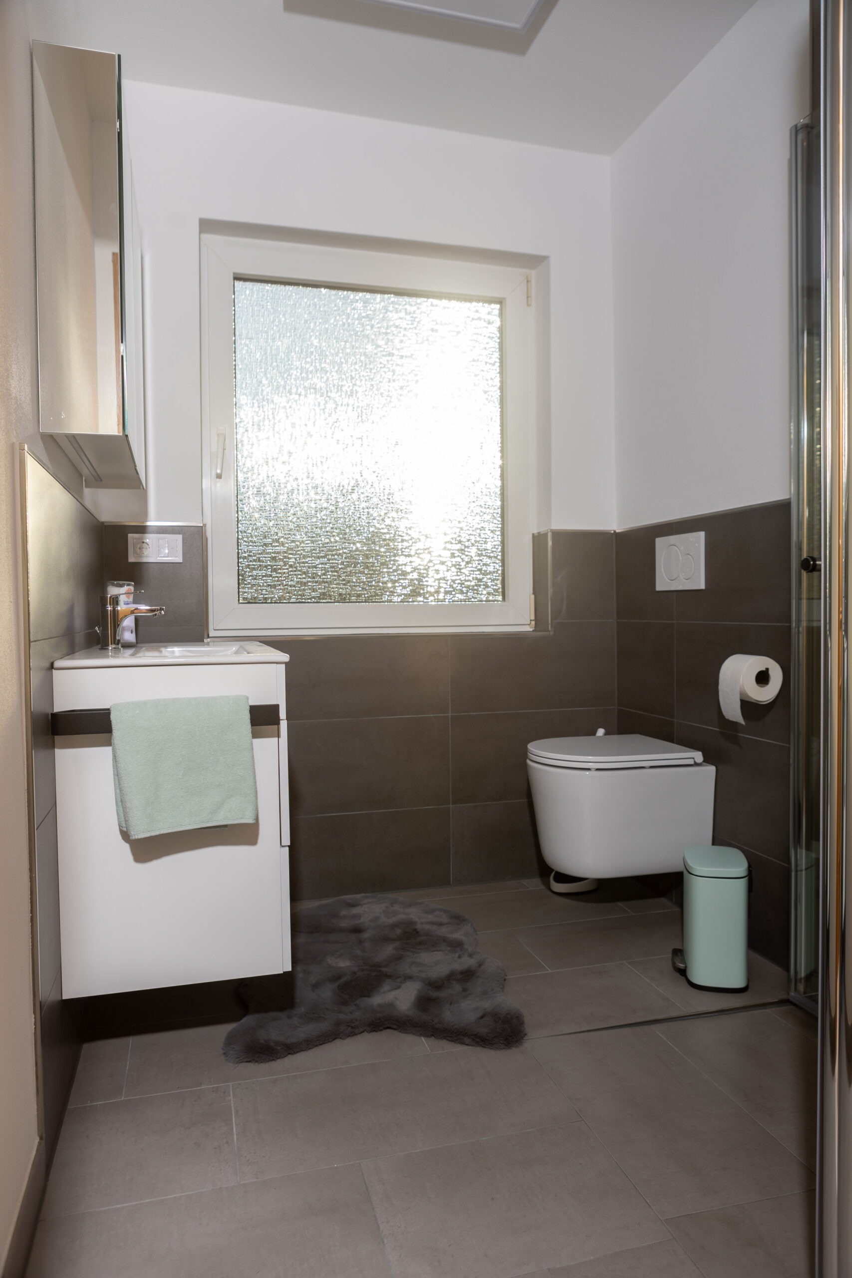 - Badezimmer: Dusche, WC, Handtücher und Föhn.